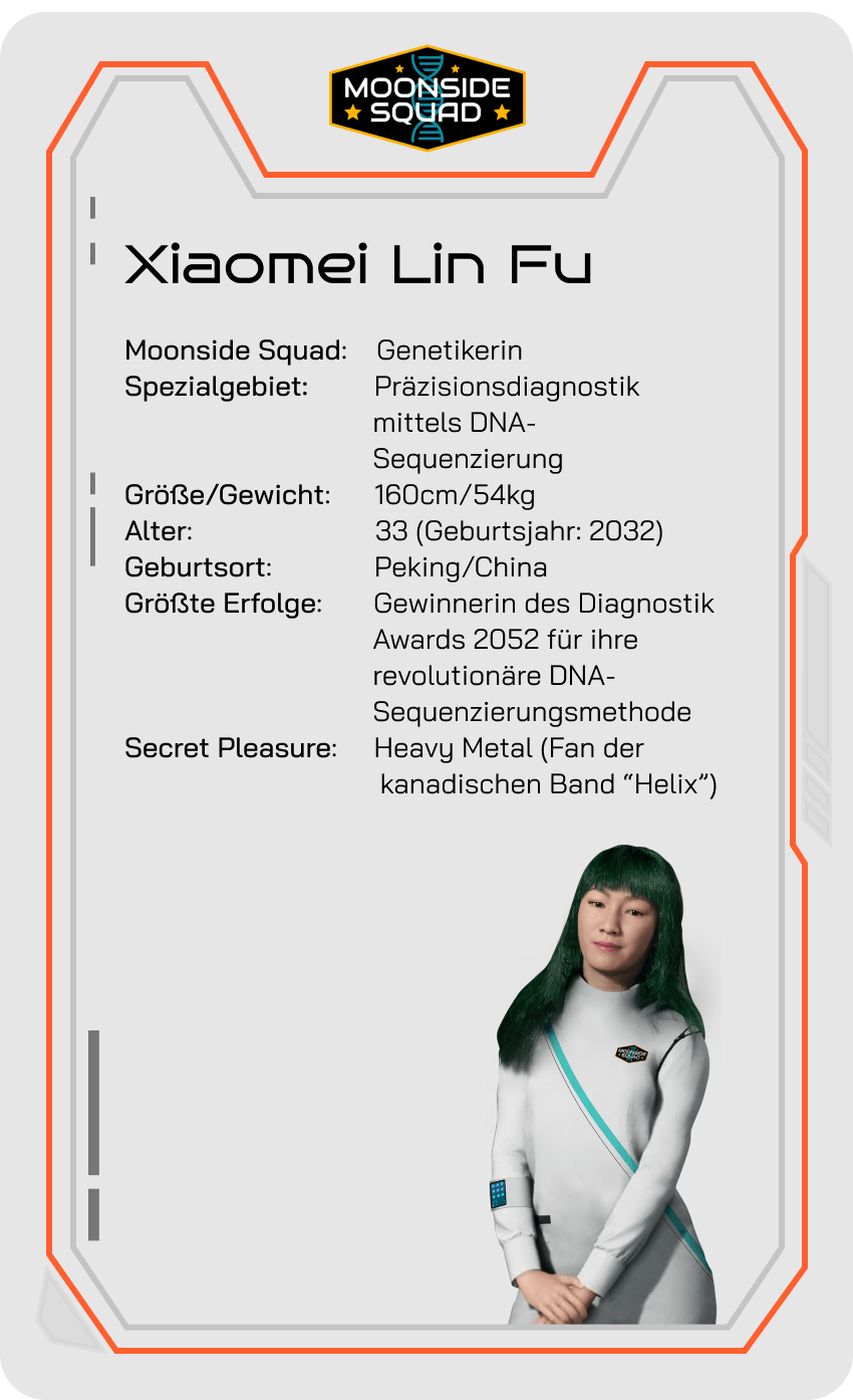 Seit 2056 leistet sie wichtige Pionierarbeit im Forschungszentrum auf Lunapolis für die Moonside Squad und engagiert sich als Vorsitzende einer ehrenamtlichen Organisation.